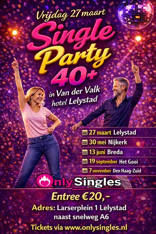 Single avond Only Singles in Van der Valk Lelystad Vrijdag 27 maart Leeftijd 40+. Dansen en Sjansen en nieuwe mensen leren kennen. Je krijgt een hele leuke uitgaansavond en misschien…